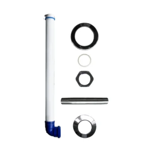 Diseñado para facilitar el montaje de sanitarios con salida posterior, el kit AyA 106-AA-ASP proporciona todos los elementos esenciales para una instalación segura y estética. El tubo principal, de 81 cm de longitud y 38 mm de diámetro, está fabricado en plástico A.B.S., lo que le confiere resistencia y ligereza. Incluye un codo recto azul para acoplamiento, escudo cónico y escudo circular grande en plástico cromado, además de una contratuerca hexagonal y un empaque cónico blanco que aseguran un cierre firme. Este conjunto es ideal tanto para nuevas instalaciones como para reemplazos en proyectos institucionales o comerciales.