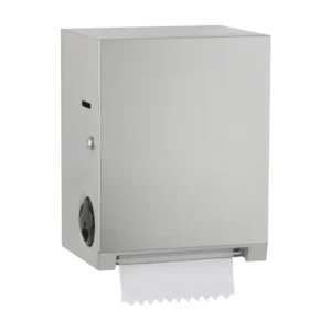 Este dispensador de toallas en rollo con cerradura, modelo de Bobrick, está fabricado en acero inoxidable con acabado satinado, ideal para baños institucionales de alto tráfico. Su diseño robusto, seguro y funcional permite la dispensación eficiente de toallas sin contacto directo, promoviendo la higiene y reduciendo el desperdicio.