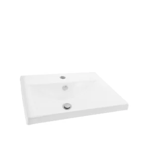 El lavamanos rectangular de semiempotrar Laum, con acabado cerámico blanco y diseño moderno, combina funcionalidad y estilo en un formato compacto ideal para baños contemporáneos.
