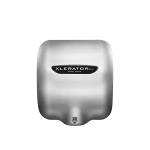 El secador de manos XLERATOR® Eco de Excel, con acabado en acero inoxidable cepillado, ofrece un secado eficaz en solo 15 segundos, sin necesidad de calefacción y con consumo energético reducido, ideal para baños públicos con alto tránsito.